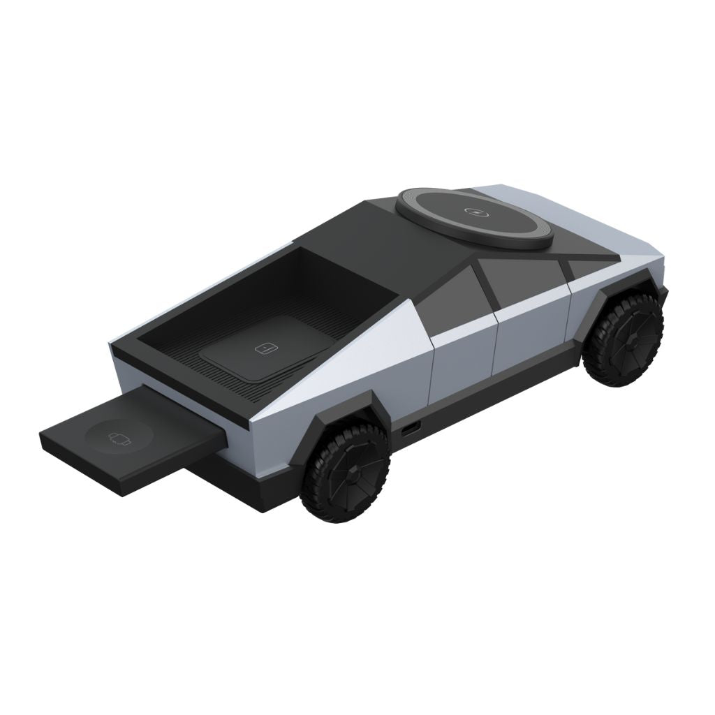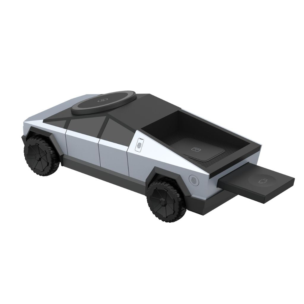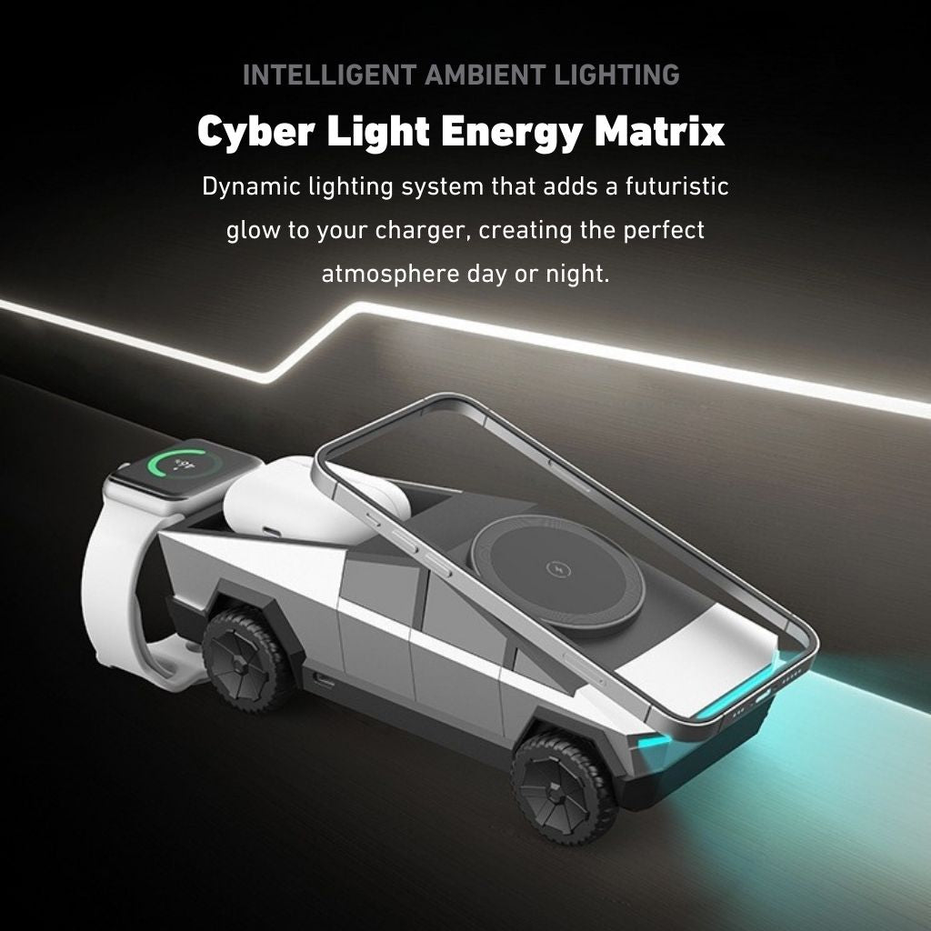 Découvrez la CyberDock 3-en-1, une station de charge sans fil MagSafe alliant technologie avancée et design inspiré du Cybertruck. Cette station élégante et fonctionnelle vous permet de recharger simultanément votre iPhone, votre Apple Watch et vos AirPods, tout en apportant une touche futuriste à votre espace.